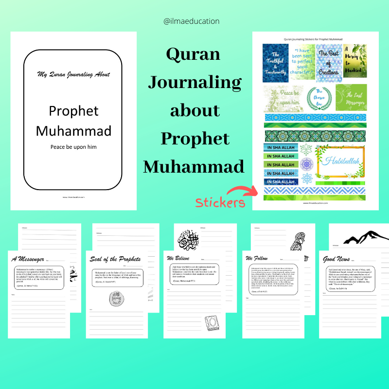 Learn more about the Prophet as your child journals about the ayats mentioning the Prophet by name in the Quran. Five ayats with a double page template for each ayah. Included is a set of beautiful stickers about the Prophet to decorate and add creativity to the journaling.